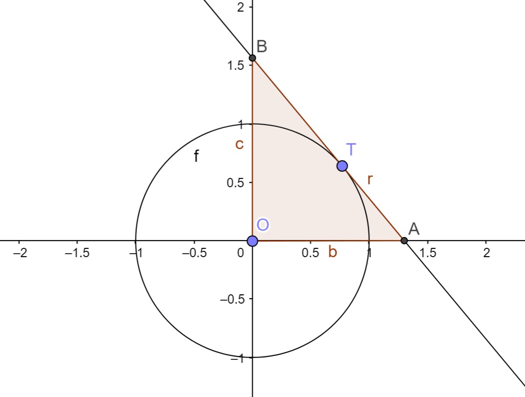 Considere a circunferência descrita pela função vetorial $$\vec{f(t)} = \left( \text{cos}(t), \text{sen}(t) \right), \qquad \text{e} \qquad 0 < \theta < 1.$$ Considere, agora, a reta r tangente a esta circunferência no ponto T = \left( \text{cos}(\theta), \text{sen}(\theta) \right) . Considere O como sendo a origem do plano cartesiano, e A e B os pontos de interseção de r com os eixos coordenados.