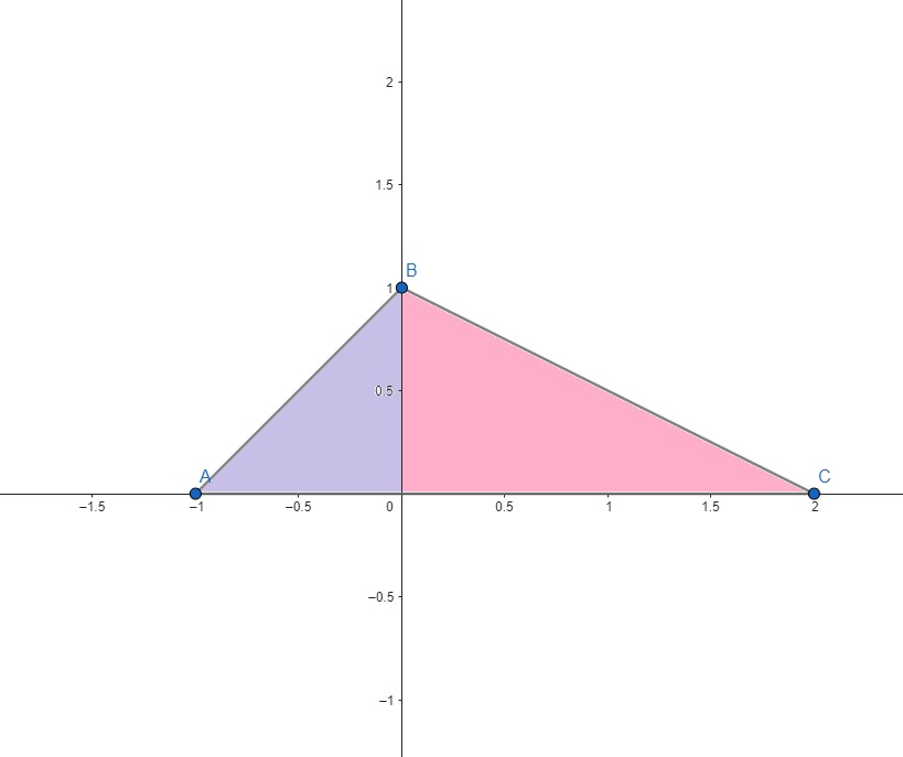 Portanto, a área do triângulo será $$\int\limits_{-1}^{0}{(x+1)dx}+\int\limits_{0}^{2}{\left( -\frac{1}{2} x +1 \right) dx} = \\ \left[ \frac{x^2}{2} + x\right]_{-1}^{0} + \left[ – \frac{x^2}{4}+x \right]_{0}^{2} = \left[ – \frac{1}{2} +1 \right] + \left[ – 1 + 2\right] = \frac{1}{2} +1 = \frac{3}{2} \text{u. a.} $$