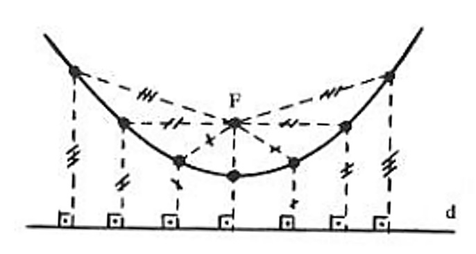 Consideraremos a parábola de foco F e diretriz d , que é o conjunto dos pontos P que são equidistantes do ponto F e a reta d .