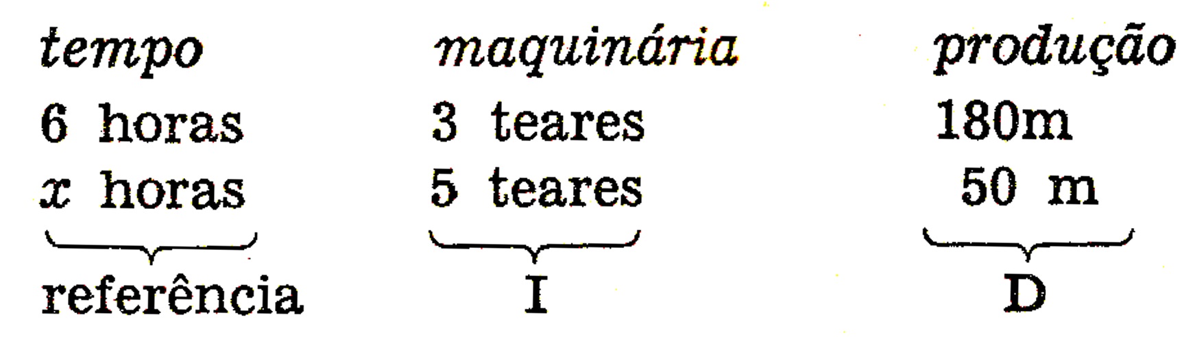 Vamos estudar esta regra através de um problema resolvido: Em 6 horas, três teares fabricam 180 metros de tecido. Em quanto tempo 5 teares, com o mesmo rendimento que o primeiro, produzirão 50 metros?