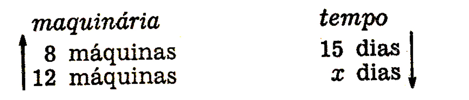 Como as flechas estão em sentido contrário, então as grandezas são inversamente proporcionais. Daí, \dfrac{15}{x} = \dfrac{12}{8} \Rightarrow 12 x = 15 \cdot 8 \Rightarrow x = \dfrac{120}{12} = 10. Resposta: x = 10 dias.