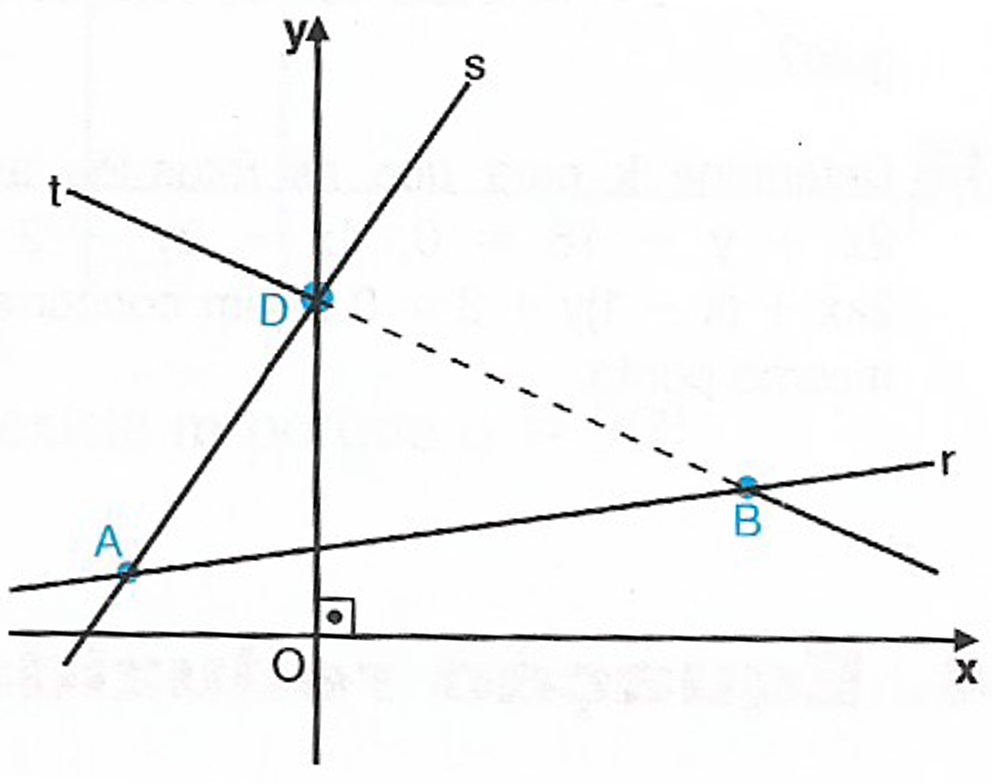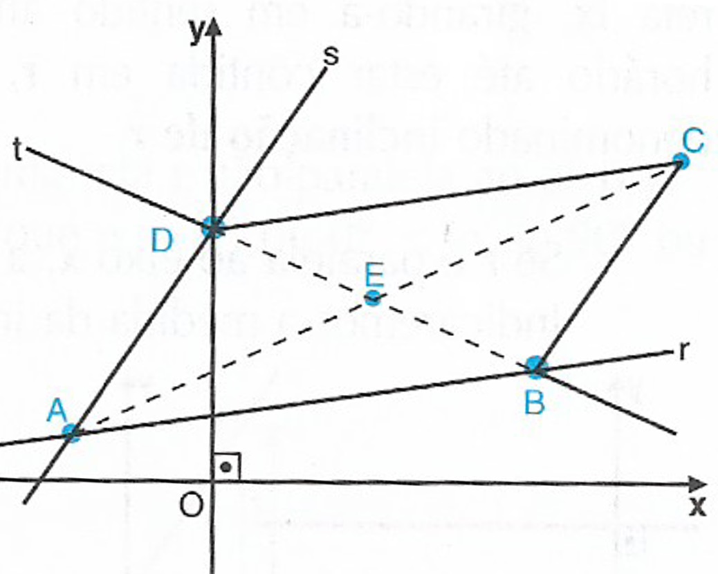 Note que A \notin t , pois -2+2 \cdot 1-8 \neq 0 . Observe que se A pertencesse a t , não seria possível determinar os vértices do paralelogramo e haveria infinitas soluções para o problema. Então a interseção de t com r e a interseção de t com s são dois outros vértices do paralelogramo. Resolvendo $$ \left\{ \begin{array}{lll}x + 2y -8 & = &0 \\ & \\ x – 6y +8 &= & 0 \\ \end{array} \right.$$ obtemos x = 4 e y = 2 . Agora, resolvendo $$ \left\{ \begin{array}{lll}x + 2y -8 & = &0 \\ & \\ 3x – 2y +8 &= & 0 \\ \end{array} \right.$$ obtemos x = 0 e y = 4 . Logo, teremos os vértices B(4,2) e D(0,4).