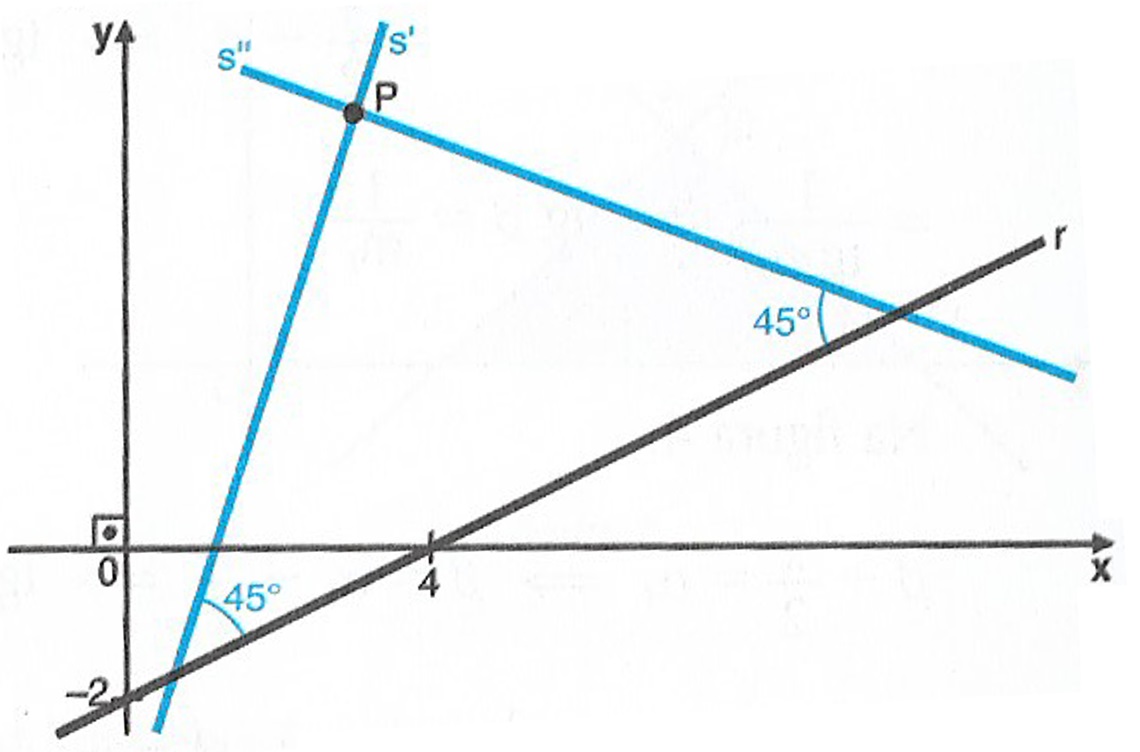 Solução: A reta s tem equação y - y_{P} = m_{s} \left( x - x_{P} \right) e r e s formam um ângulo agudo \beta = \frac{ \pi }{4} ; e pela equação da reta r temos que m_{r} = \dfrac{1}{2}. Para calcular m_{s} , temos: $$ \text{tg} \beta = \left| \frac{m_r – m_s}{1 + m_r m_s} \right| \Rightarrow \text{tg} \frac{\pi}{4} = \left| \frac{\frac{1}{2} – m_s}{1 + \frac{1}{2} m_s} \right| \Rightarrow 1 = \left| \frac{1 – 2m_s}{2 + m_s} \right| \Rightarrow \frac{1 – 2m_s}{2 + m_s} = \pm 1 $$ O que nos leva a $$ \frac{1 – 2m_s}{2 + m_s} = 1 \Rightarrow m_s = – \frac{1}{3} $$ ou $$ \frac{1 – 2m_s}{2 + m_s} = -1 \Rightarrow m_s = 3 .$$ Em y - y_{P} = m_{s} \left( x - x_{P} \right) , sabendo que s passa por P(3,5) , vem: