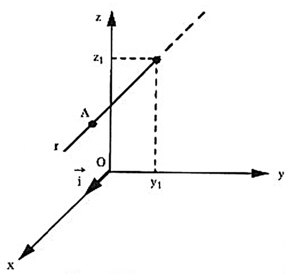 Neste caso, as equações ficam $$ \left\{ \begin{array}{rrr} x & = & x_1 \\ & \\ \frac{y – y_1}{b} & = & \frac{z – z_1}{c} \end{array} \right. .$$ nas quais se verifica que, das coordenadas (x,y,z) de um ponto genérico P da reta r , variam somente em y e z , conservando-se que x = x_1 constante. Isso significa que a reta r se acha num plano paralelo ao plano coordenado yOz , conforme a figura abaixo.