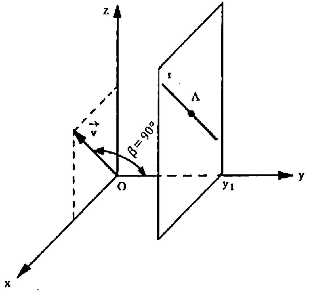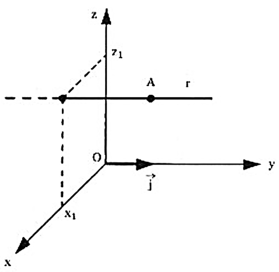 Neste caso, as equações ficam $$ \left\{ \begin{array}{rrr} y & = &y_1 \\ & \\ \frac{x – x_1}{a} & = & \frac{z – z_1}{c} \end{array} \right. $$ nas quais se verifica que, das coordenadas (x,y,z) de um ponto genérico P da reta r , variam somente em x e z , conservando-se que y = y_1 constante. Isso significa que a reta r se acha num plano paralelo ao plano coordenado xOz , conforme a figura abaixo.
