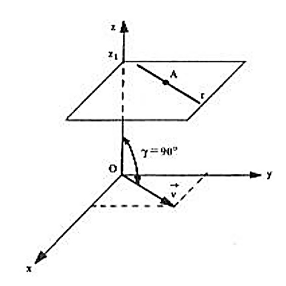 Neste caso, as equações ficam $$ \left\{ \begin{array}{rrr} z & = &z_1 \\ & \\ \frac{x – x_1}{a} & = & \frac{y – y_1}{b} \end{array} \right. $$ nas quais se verifica que, das coordenadas (x,y,z) de um ponto genérico P da reta r , variam somente em x e z , conservando-se que z = z_1 constante. Isso significa que a reta r se acha num plano paralelo ao plano coordenado xOy , conforme a figura abaixo.