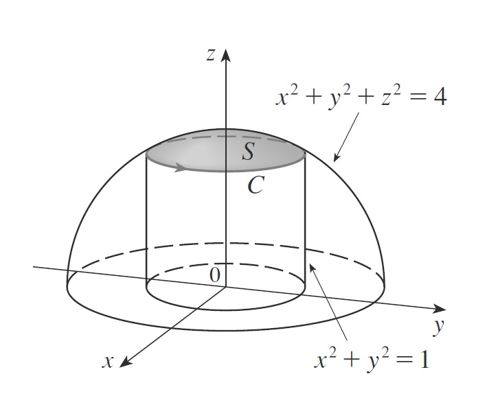 1) Use o Teorema de Stokes para calcular a integral $$\iint\limits_{S} rot \vec{f} \cdot dS,$$ onde $$ \vec{f} (x,y,z) = xz \vec{i} +yz \vec{j} + xy \vec{k} $$ e S é a parte da esfera x^2 + y^2 + z^2 = 4 que está dentro do cilindro x^2 + y^2 = 1 e acima do plano-xy (ilustrada na figura abaixo).