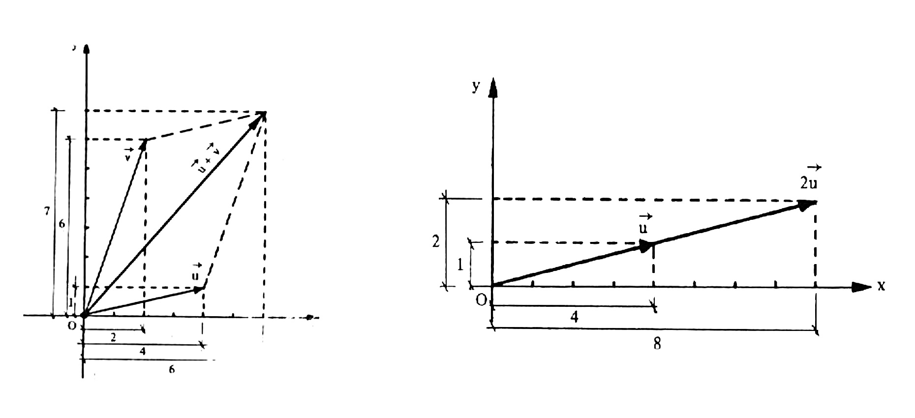 Dados os vetores \vec{u} = \left(4,1 \right) e \vec{v} = \left(2,6 \right) temos que $$ \vec{u} + \vec{v} = \left( 4+2 , 1+6 \right) = (6,7) $$ $$ 2 \vec{u} = 2 \left( 4,1\right) = \left( 8,2 \right) $$ Ambos estão ilustrados abaixo: